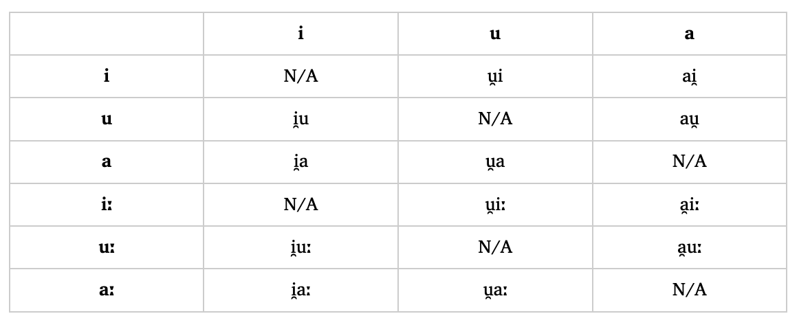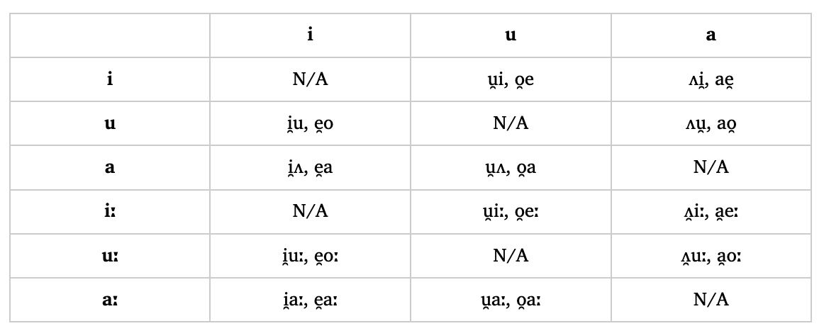 As you can see, this language has a lot of potential diphthongs, including some pretty weird ones. These diphthongs hit the precise phonaesthetic I’m going for, particularly the lowered ones, which remind me of Latin (oe, ae) and Old English (eo, ea).