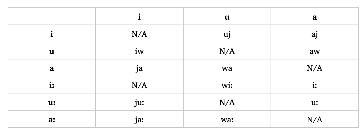 With this final chart, we can also see that the syllable structure of this language has changed. Keep in mind that, unlike the semivowels in Language 1a, [j] and [w] are true approximants, acting as consonants and existing outside the syllable nucleus. While the monophthongization has prevented them from occurring at syllable codas, they can still occur at syllable onsets. Thus, the syllable structure shifted from (C)V(C) to (C)(W)V(C) (where W is a glide).