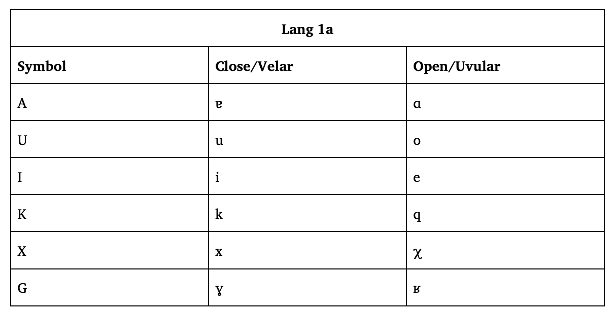 Underspecification is not something that I understand fully. But, when talking about harmony, an underspecified phooneme is a symbol used to refer to all potential versions of a phoneme in words with different harmonies. For instance, in language 1a, the underspecified phoneme /I/ corresponds to the phonemes [i] and [e]. These are helpful when writing out morphology – because instead of having to write each form of the affix, you can write it using the archiphoneme. To do that, however, we’ll need to set what these underspecified phonemes are: